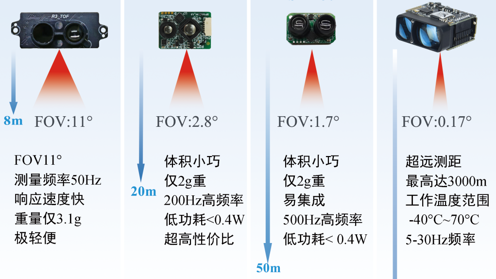 MUR3T系列,仅重3.1g,续航影响极小。支持50Hz高速测量,精度达±6cm,覆盖0.1-14米范围,满足无人机贴地、悬停等近距感知需求。