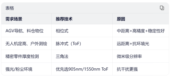 激光测距不是“越贵越好”,而是“合适才最好”。理解不同原理的底层逻辑,才能在项目中做出最优选择。