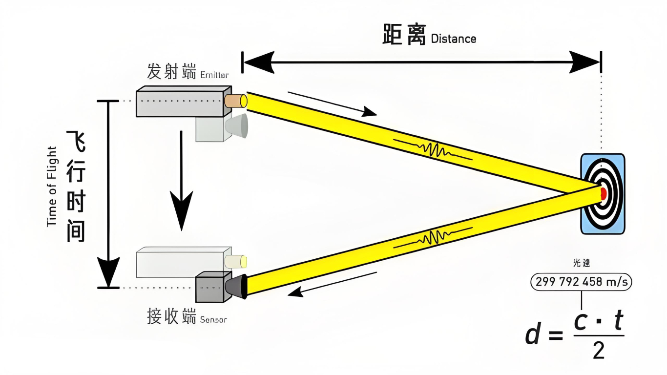 激光测距的核心思想其实很简单:测量激光从发射到击中目标再返回的时间,利用光速计算距离。