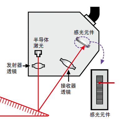 原理:利用几何三角关系——激光发射器、被测物体、接收器构成一个三角形,通过CCD/CMOS传感器检测光斑位置变化来计算距离。